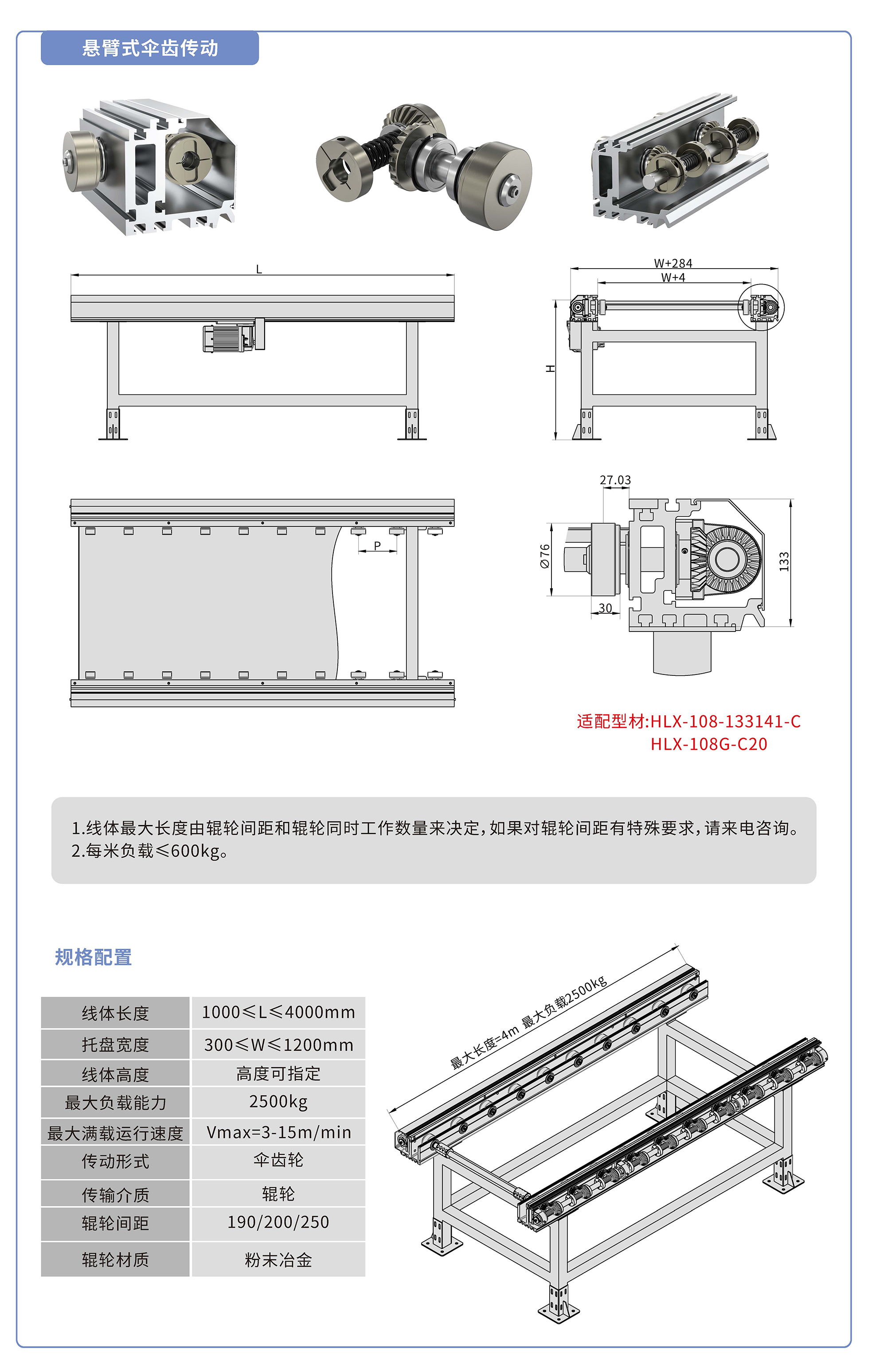 采用133141鋁型材,傘齒驅動,粉末冶金滾輪鑲嵌銅套實現積放功能,負載2500kg/米,最大負載速度15M/min, 輪距190、200、250可選,適用托盤寬度300-1200mm,線體長度范圍1000-4000mm, 高度根據需求定制.