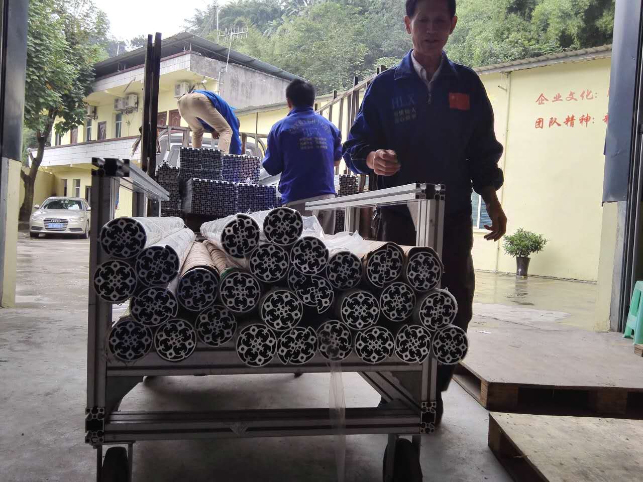 匯利興戰士們小心翼翼的抬放,并且將一根根鋁型材整齊擺放在貨車上。(專心、專業、專注、專家-匯利興)