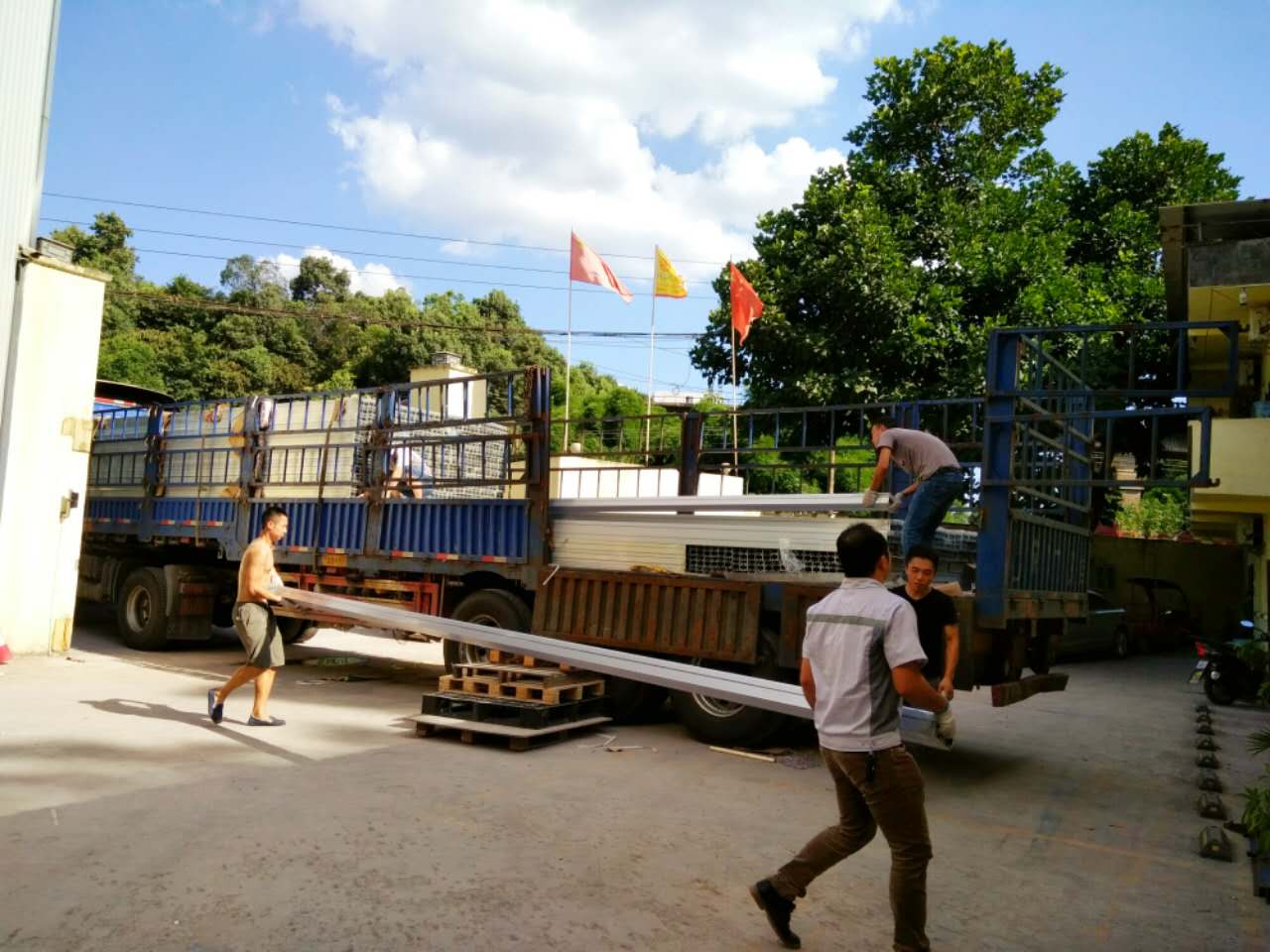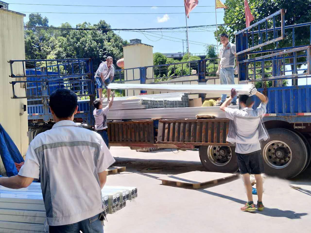 泛藍的天空與匯利興碧綠的大樹、整卡車鋁材、干勁十足的人融合一起,顯的匯利興別具一格,并在此盛夏炎熱之際,匯利興仍是一道靚麗的風景線、毫不失遜色。在這里,還有一群敬業精業的匯利興家人們,他們始終踐行著“創于手、精于工、智于器、匠于心、品于行”的工匠精神,并精工打造每件產品并在高達35℃高溫環境下依舊持續戰斗著,在此感謝他們的努力與付出,你們辛苦了!!!