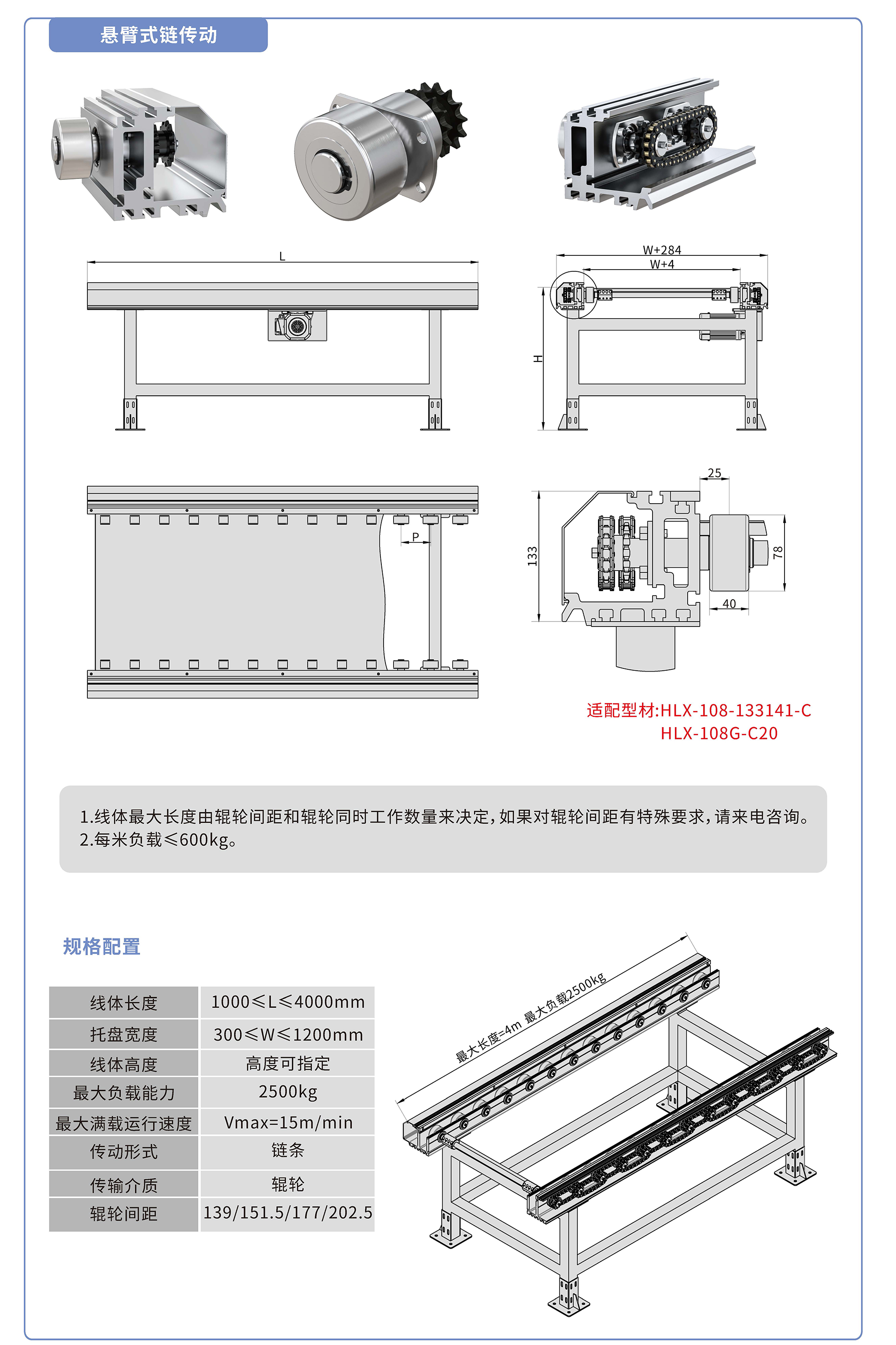 采用133141鋁型材,鏈輪傳動,鍍鉻滾輪鑲嵌銅套實現積放功能,負載2500kg/米,最大負載速度15M/min, 輪距139、151.5、177、202.5可選,適用托盤寬度300-1200mm,線體長度范圍1000-4000mm, 高度根據需求定制.