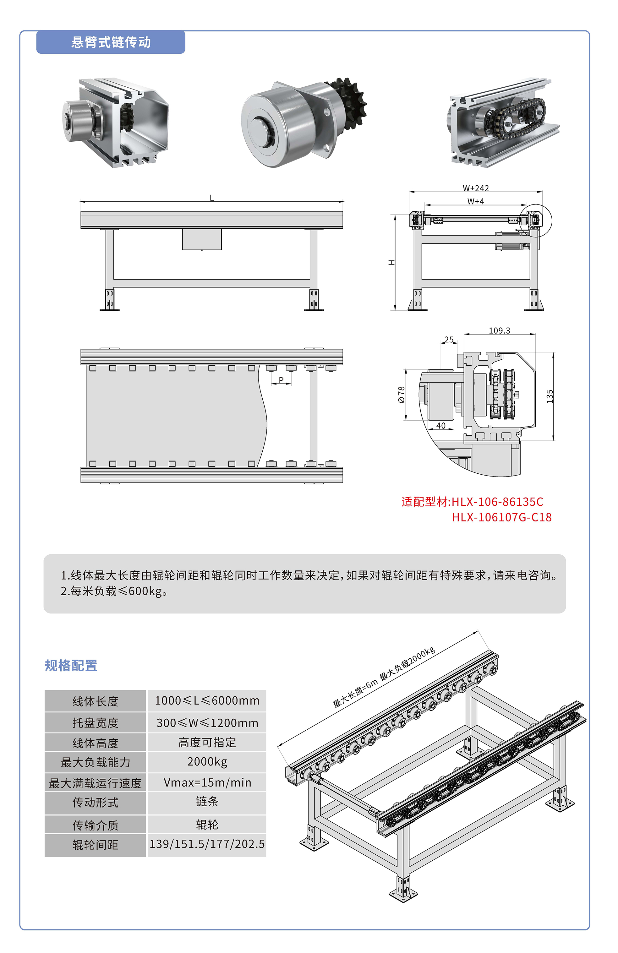 懸臂式鏈傳動:采用86135鋁型材,鏈輪傳動,鍍鉻滾輪鑲嵌銅套實現積放功能,負載2000kg/米,最大負載速度15M/min, 輪距139、151.5、177、202.5可選,適用托盤寬度300-1200mm,線體長度范圍1000-6000mm, 高度根據需求定制