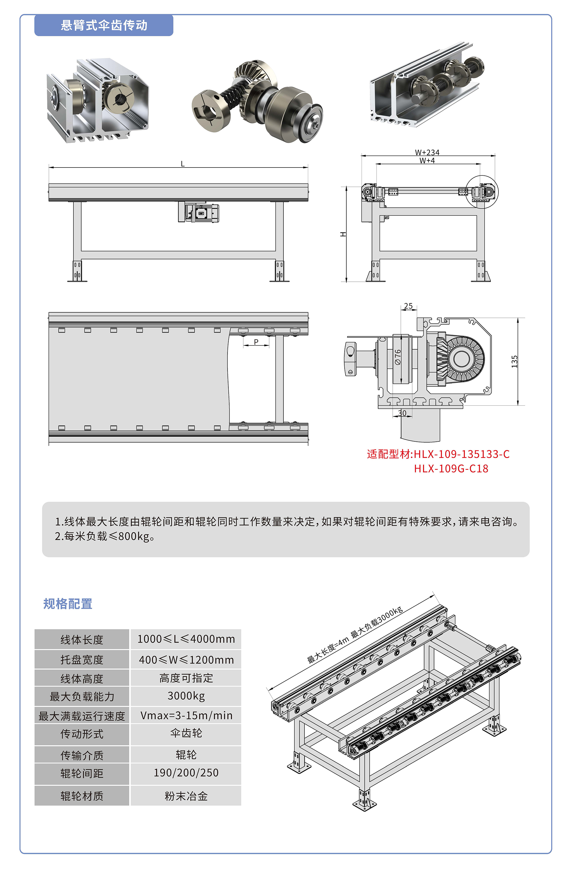 適配135133鋁型材,采用傘齒驅動,鍍鉻滾輪鑲嵌銅套實現積放功能,負載3000kg/米,最大負載速度15M/min, 輪距190、200、250可選,適用托盤寬度400-1200mm,線體長度范圍1000-4000mm, 高度根據需求定制.